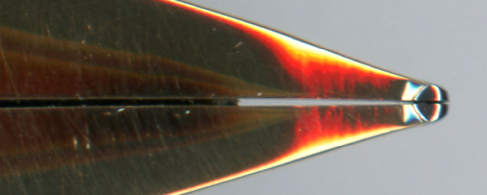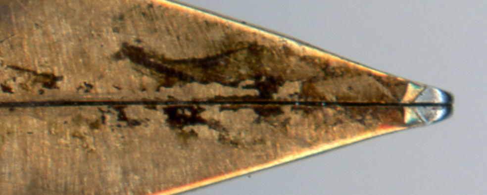 元々は円盤を二枚貼り合わせたようなペンポイントであったが、かなり研磨して鉈型のペンポイントにした。接紙面積が狭いのにもかかわらずインクフローが悪くないので、不思議とここちよい!