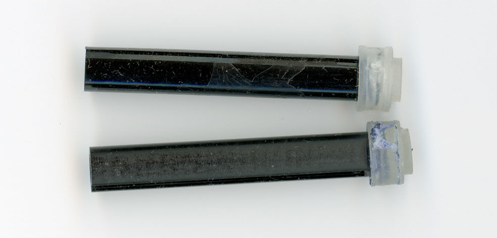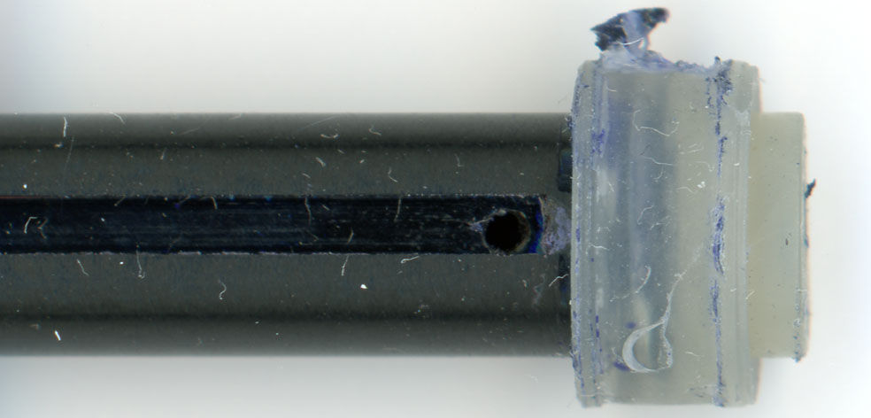 右側画像のように先端部の一部が見事にめくれ上がっており、これがスムーズなピストンの上下を妨げていたのと同時に、インクの抜け道を作っていたのじゃ。これは左画像の上側のスペア・ピストンと交換した。