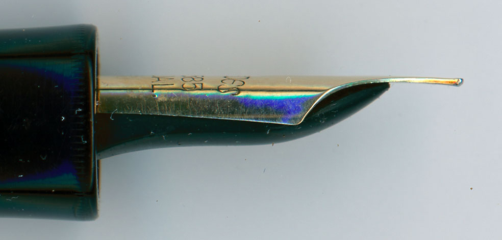 ペン先は幅が狭く、曲げもきついのでタッチは柔らかくはない。また刻印も深くしっかりと入っている。一般的に刻印が深いとペン先は硬くなると聞いたことがある。Pilotの現行ニブもフォルカンには模様が少ないが、それも柔らかさを保つためなのかもしれない。![]()
