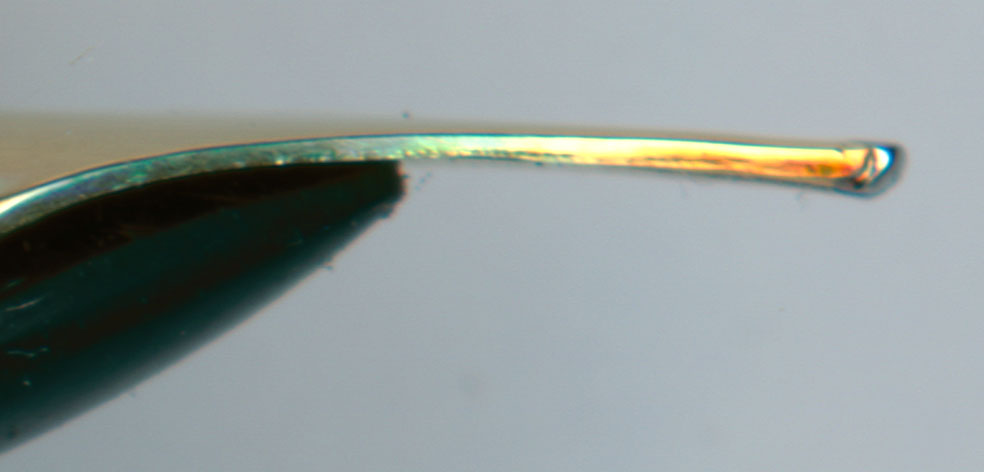 修理依頼が来たのは、インクがすぐに出なくなってしまうから。さてはペン芯とペン先が離れているのか?と凝視してみたが、そちらは問題はなさそう。多少コテ研ぎ風になっている程度。