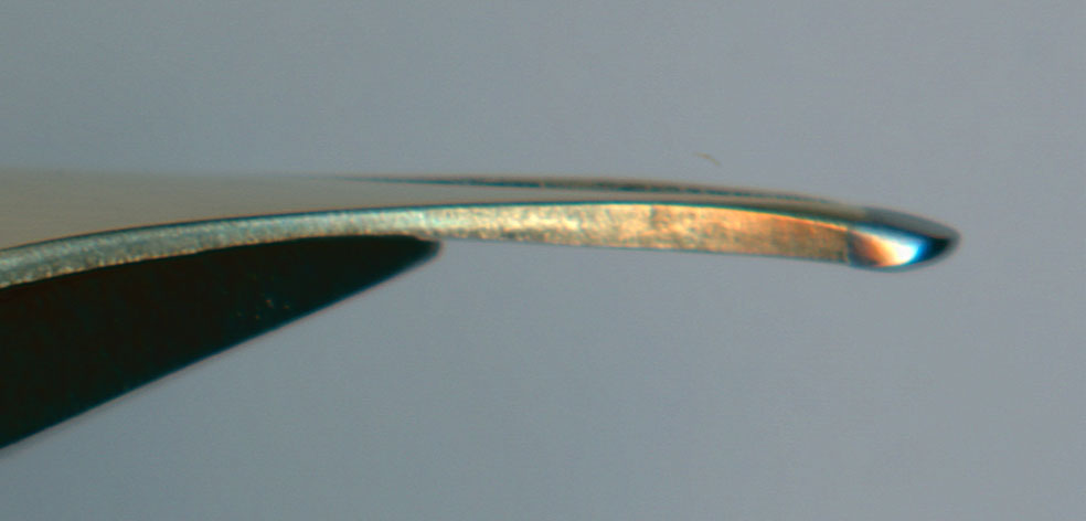 画像のペン先上部の黒く見える部分が段差。ペン先の段差を直す際には、ペン先をペン芯から外し、ハート穴からペンポイントに至るスリットの両側の高さを揃えるよう、時間をかけて段差調整をするのが王道なのだが、プロもアマも、ペンクリでの段差調整は先端部だけで辻褄を合わせている人が多い。これは生産性向上のためだが、見栄えが悪くなるので、拙者は可能な限りハート穴からペンポイントまでの段差調整を行っている。