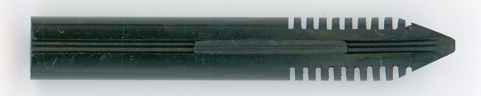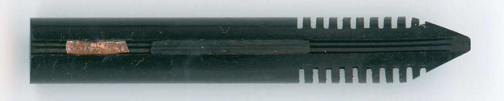なんとペン芯に空気流入を押さえるエボナイトの加工品が入っていた。この細工の細かさにビックリ。画像では大きく見えるが、実際には幅は1ミリも無い。しかも下部は平坦でインクは問題なくインク溝を流れるようになっている。また上には浅い溝が彫ってあり、空気の流入はこの溝によって制限され、結果として空気の代替として出てくるインク量を減らす仕組みじゃ。
