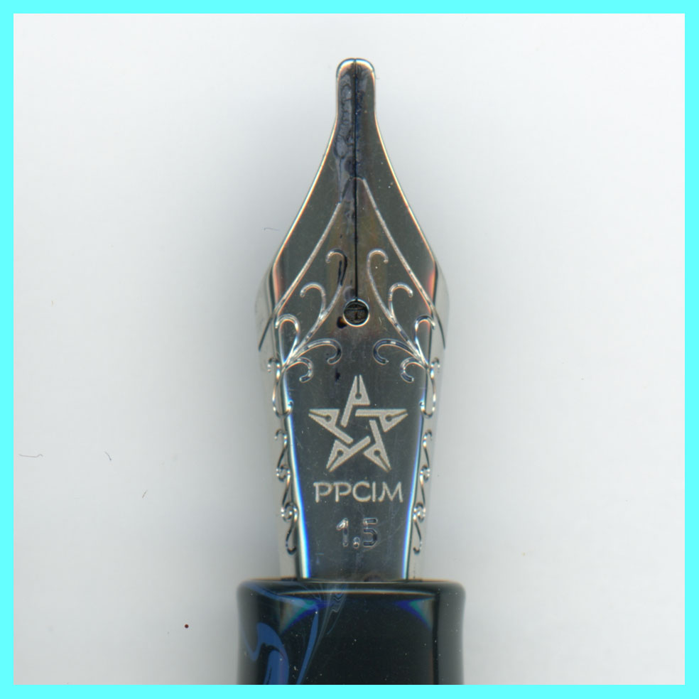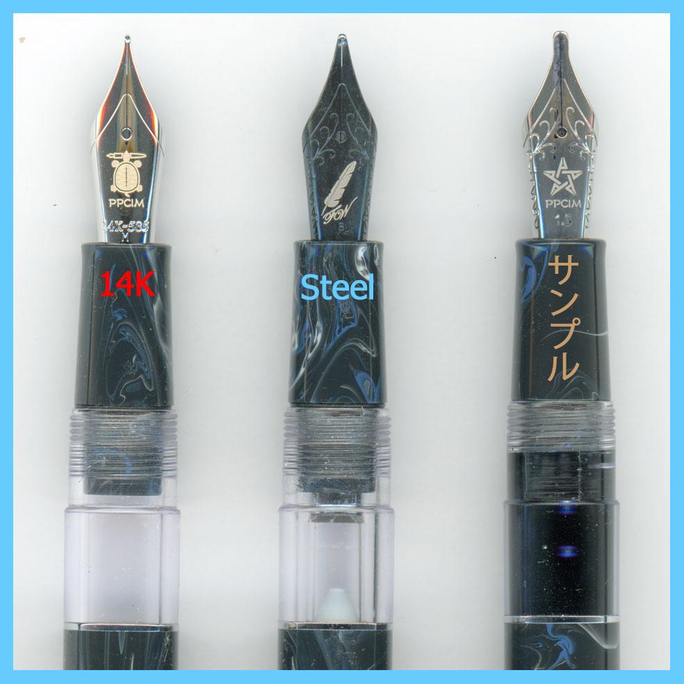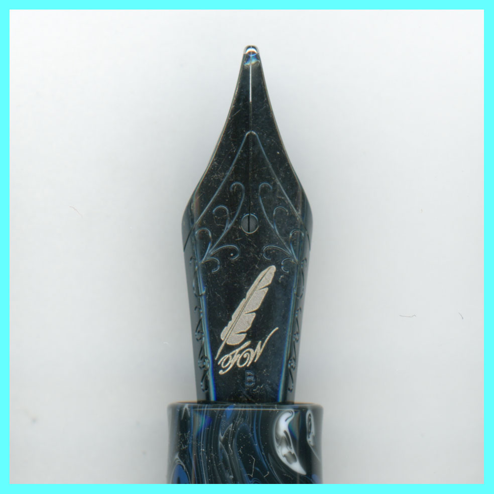 ペン先はロジウムコートされた14金ペン先で、レーザー刻印を入れる際にレーザーが表面のロジウム鍍金膜を溶かして下地の金が模様として浮かび上がる。